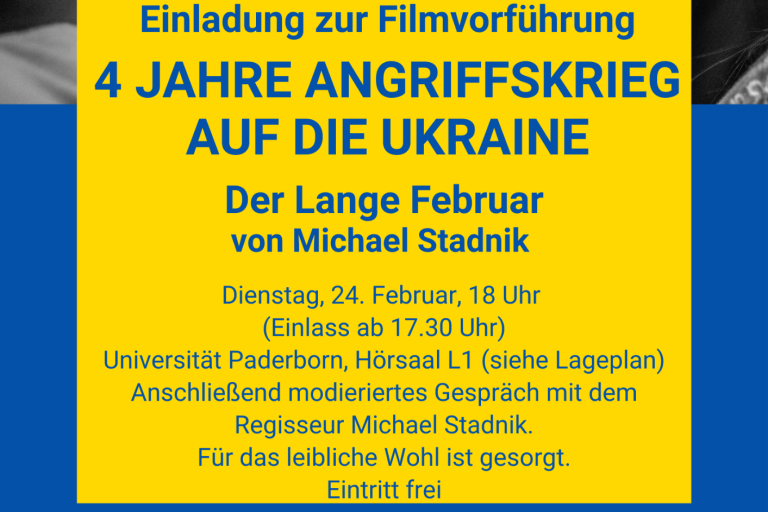Anlässlich des 4. Jahrestages des russischen Angriffskrieges auf die Ukraine haben wir am 24.02.2026 in Kooperation mit der Fakultät für Maschinenbau in den Hörsaal L1 zur Filmvorführung "Der lange Februar" eingeladen. Weitere Infos HIER.